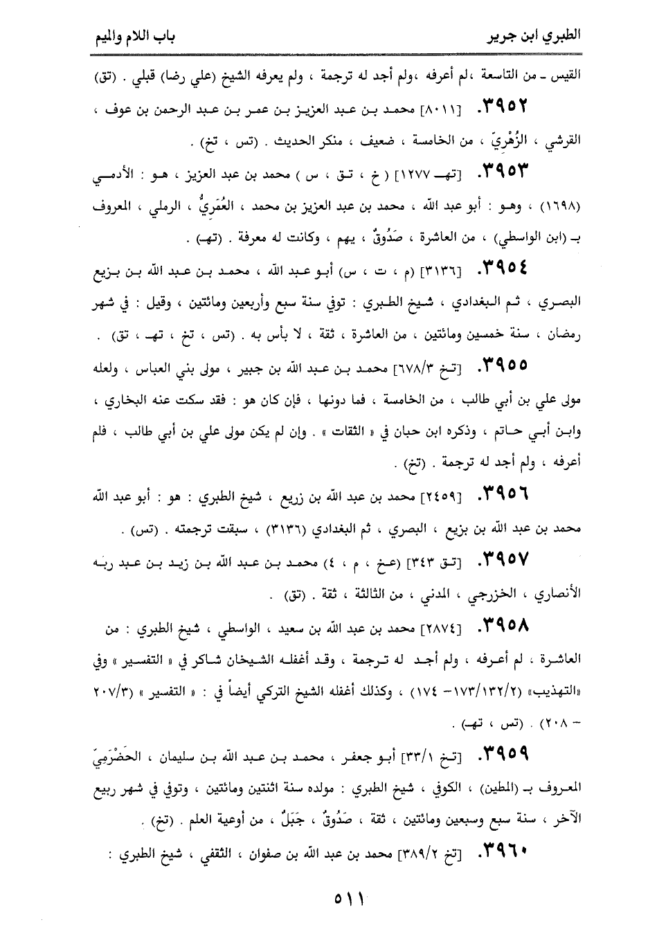 3958. [2874] محمد بن عبد الله بن سعيد، الواسطي، شيخ الطبري: من العاشرة، لم أعرفه، ولم أجد له ترجمة، وقد أغفله الشيخان شاكر في ((التفسير)) وفي ((التهذيب)) (2/ 132\ 173 - 174)، وكذلك أغفله الشيخ التركي أيضًا في: ((التفسير)) (3/ 207 - 208). (تس، تهـ).