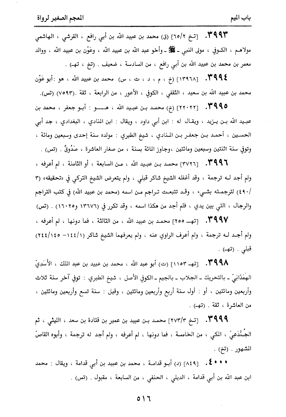 3997. [تهـ 255] محمد بن عبيد الله، من الثالثة، فما دونها، لم أعرفه، ولم أجد له ترجمة، ولم أعرف الراوي عنه، ولم يعرفهما الشيخ شاكر (1/ 144 - 145/ 244) قبلي. (تهـ).