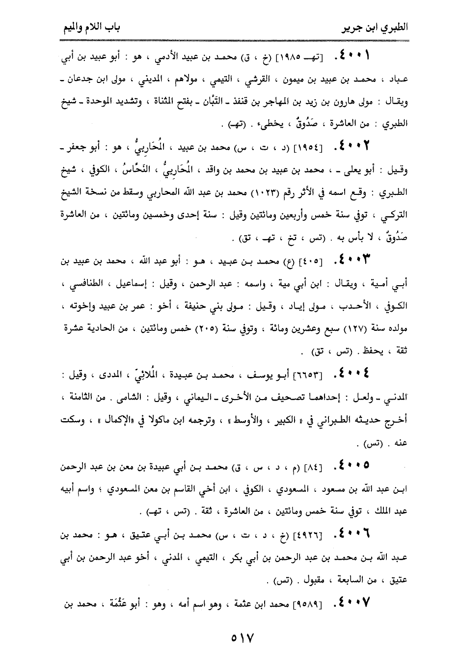 4005. [48] (م، د، س، ق) محمد بن أبي عبيدة بن معن بن عبد الرحمن بن عبد الله بن مسعود، المسعودي، الكوفي، ابن أخي القاسم بن معن المسعودي، واسم أبيه عبد الملك، توفي سنة خمس ومائتين، من العاشرة، ثقة. (تس، تهـ).