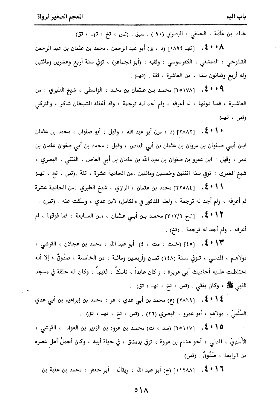 4008. [تهـ 1894] (د، ق) أبو عبد الرحمن، محمد بن عثمان بن عبد الرحمن التنوخي، الدمشقي، الكفرسوسي، ولقبه: (أبو الجماهر)، توفي سنة أربع وعشرين ومائتين وله أربع وثمانون سنة، من العاشرة، ثقة. (تهـ).