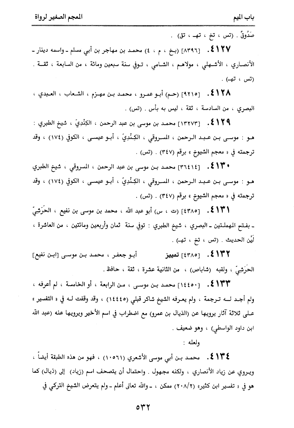 4134. محمد بن أبي موسى الأشعري (10561)، فهو من هذه الطبقة أيضًا، ويروي عن زياد الأنصاري، ولكنه مجهول. واحتمال أن يتصحف اسم (زياد) إلى (ذيال) كما هو في ((تفسير ابن كثير)) (2/ 208) ممكن - والله تعالى أعلم - ولم يتعرض الشيخ التركي في