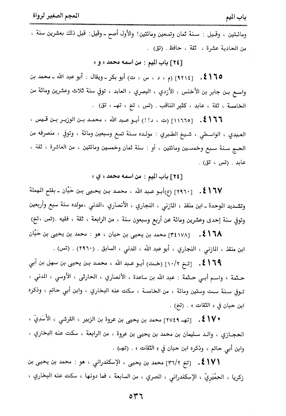 4167. [2960] (ع) أبو عبد الله، محمد بن يحيى بن حَبَّان - بفتح المهملة وتشديد الموحدة - ابن منقذ، المازني، النجاري، الأنصاري المدني، مولده سنة سبع وأربعين وتوفي سنة إحدى وعشرين ومائة عن أربع وسبعين سنة، من الرابعة، ثقة، فقيه. (تس، تخ).