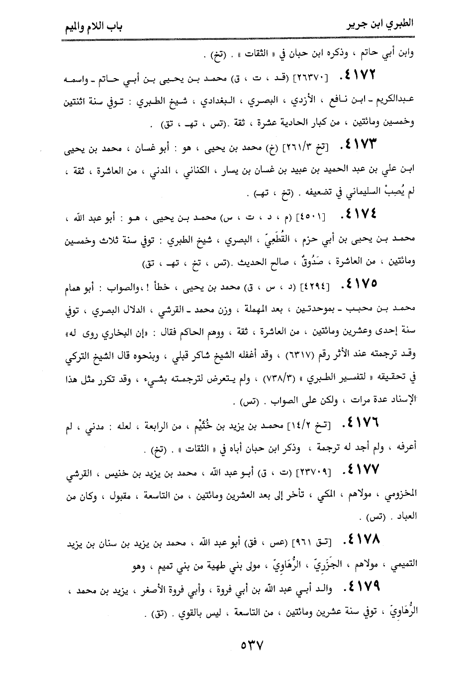 4172. [26370] (قد، ت، ق) محمد بن يحيى بن أبي حاتم - واسمه: عبد الكريم - ابن نافع، الأزدي، البصري، البغدادي، شيخ الطبري: توفي سنة اثنتين وخمسين ومائتين، من كبار الحادية عشرة، ثقة. (تس، تهـ، تق).