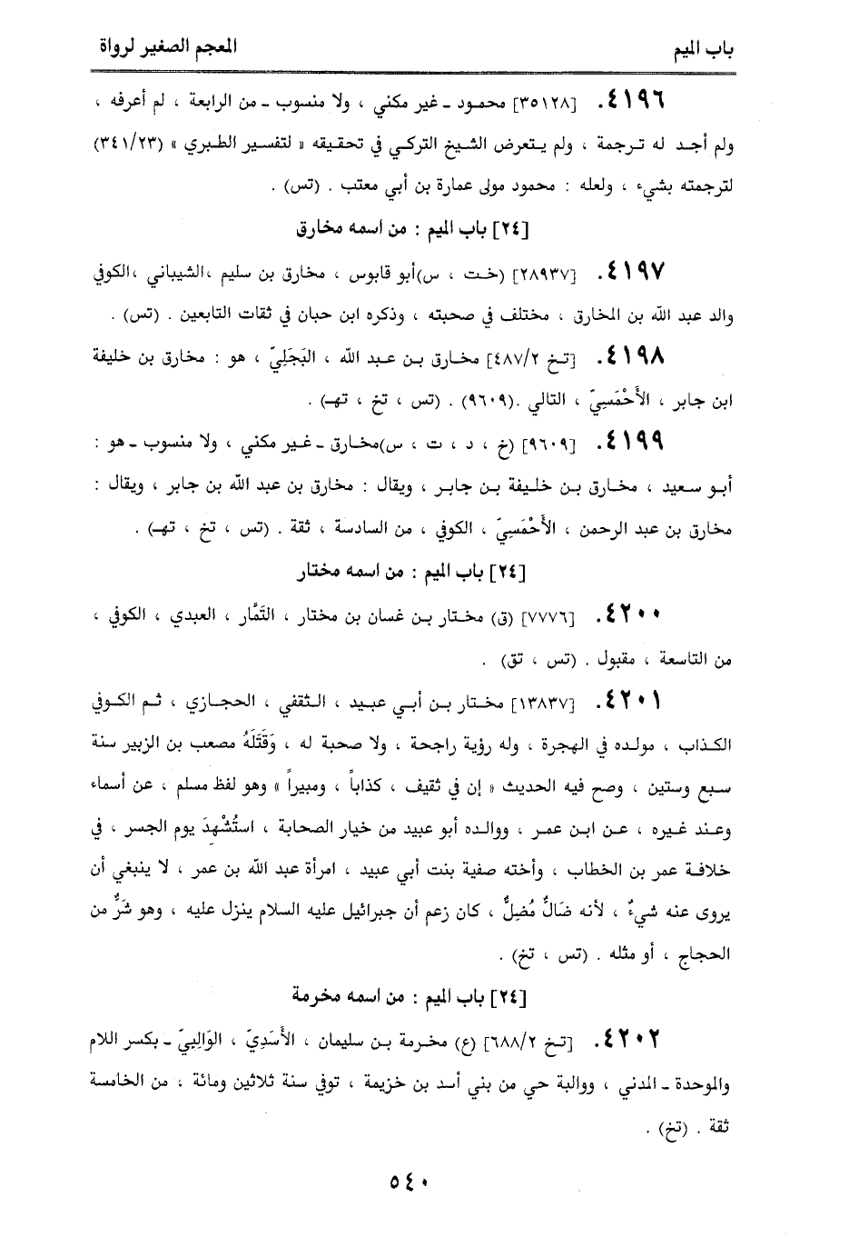 4200. [7776] (ق) مختار بن غسان بن مختار، التَمَّار، العبدي، الكوفي، من التاسعة، مقبول. (تس، تق).