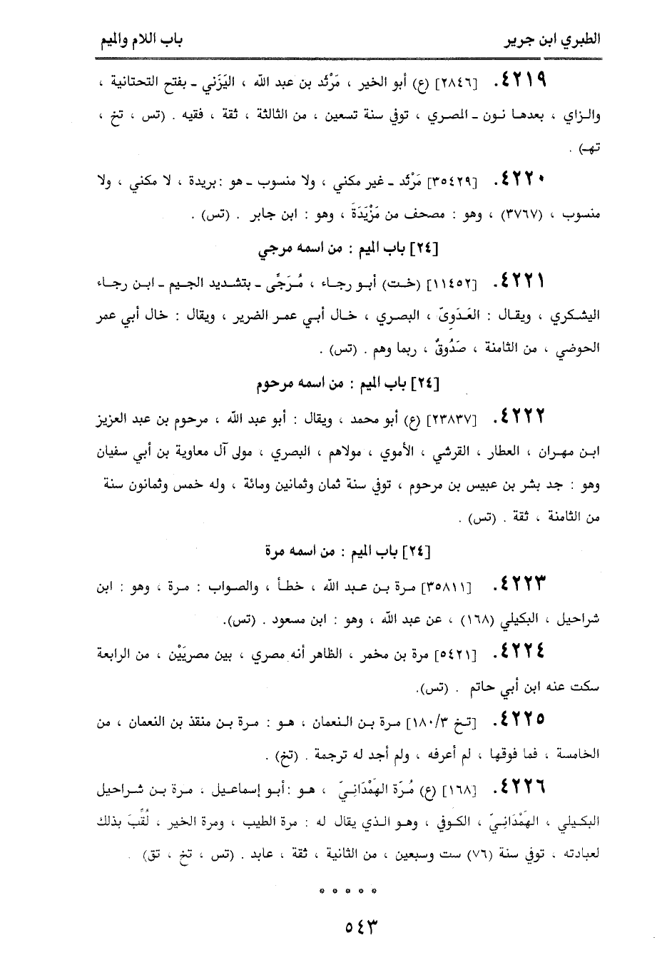 4226. [168] (ع) مُرّة الهَمدَانِيَ، هو: أبو إسماعيل، مرة بن شراحيل البكيلي، الهَمدَانِيَ، الكوفي، وهو الذي يقال له: مرة الطيب، ومرة الخير، لُقبَ بذلك لعبادته، توفي سنة (76) ست وسبعين، من الثانية، ثقة، عابد. (تس، تخ، تق).
