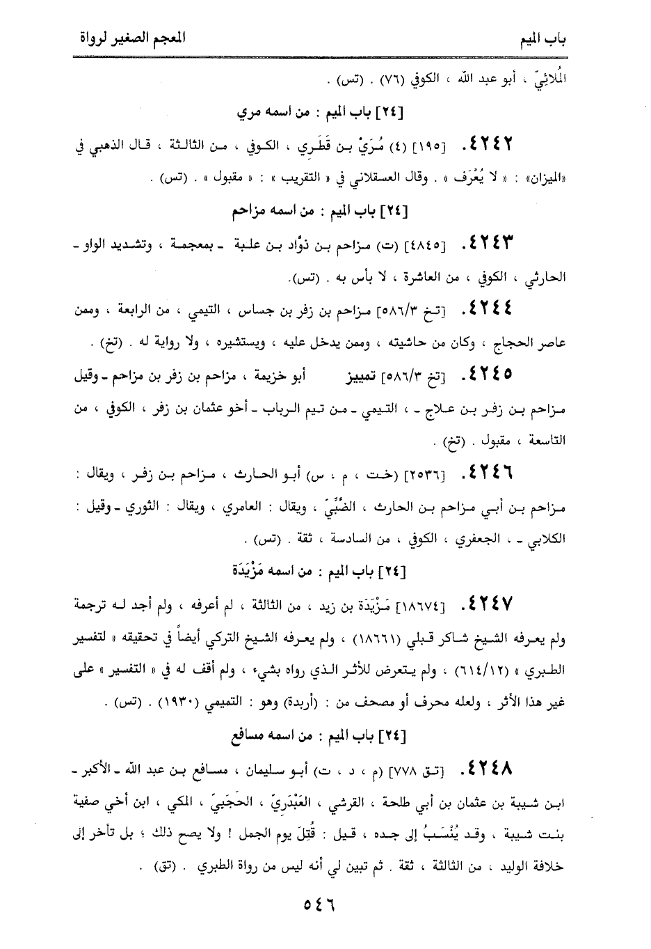 4242. [195] (4) مُرَي بن قَطَرِي، الكوفي، من الثالثة، قال الذهبي في ((الميزان)): ((لا يُعرَف)). وقال العسقلاني في ((التقريب)): ((مقبول)). (تس).