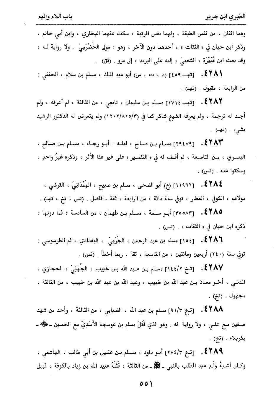 4288. [تخ 3/ 91] مسلم بن عبد الله، الضبابي، من الثالثة، وأحد من شهد صفين مع علي، ولا رواية له، وهو الذي قَتَلَ مسلم بن عوجسة الأسَدِي مع الحسين - رضي الله عنه - بكربلاء. (تخ).