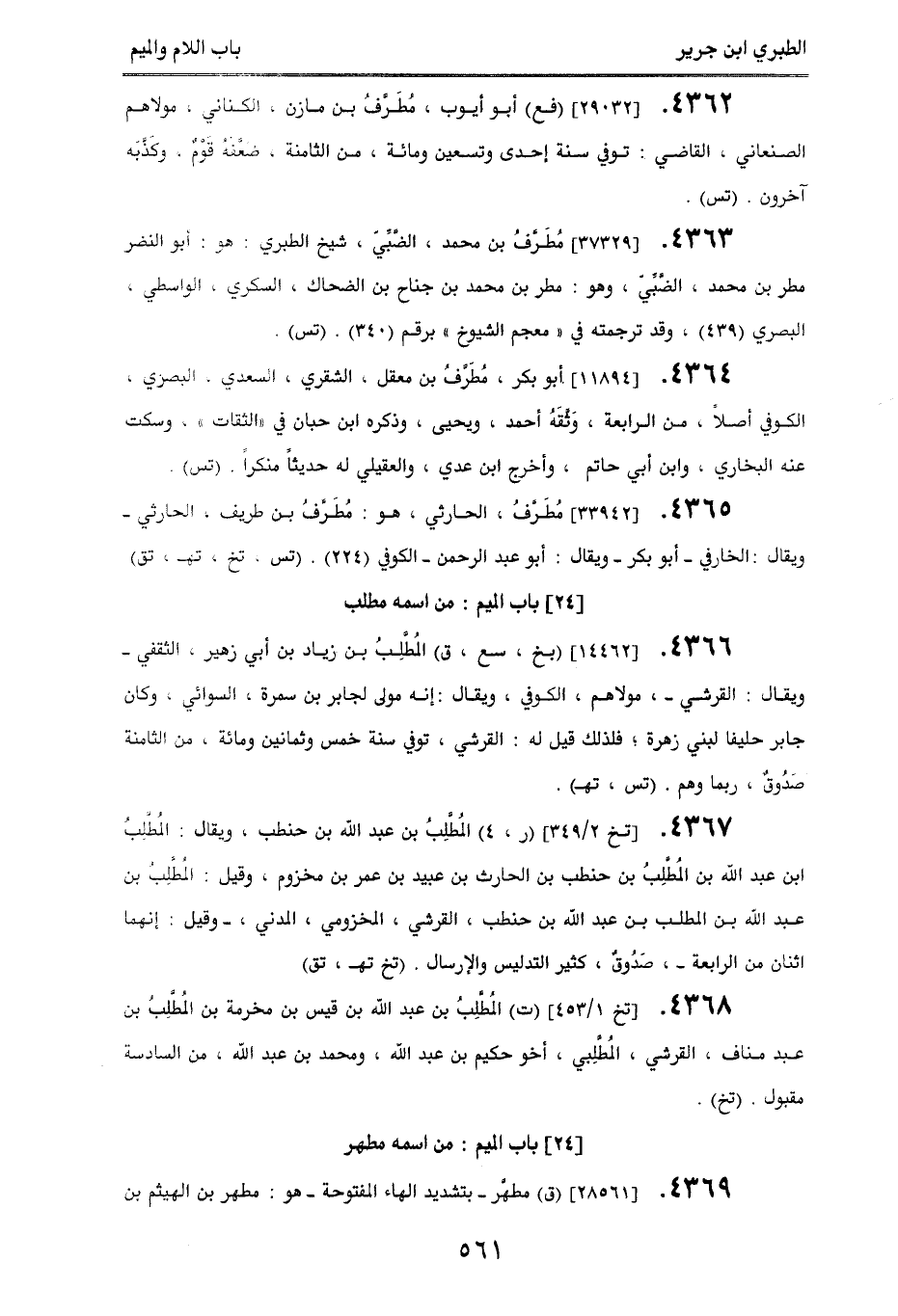 4363. [37329] مُطَرفُ بن محمد، الضَّبي، شيخ الطبري: هو: أبو النضر مطر بن محمد، الضَّبي، وهو: مطر بن محمد بن جناح بن الضحاك، السكري، الواسطي، البصري (439)، وقد ترجمته في ((معجم الشيوخ)) برقم (340). (تس).