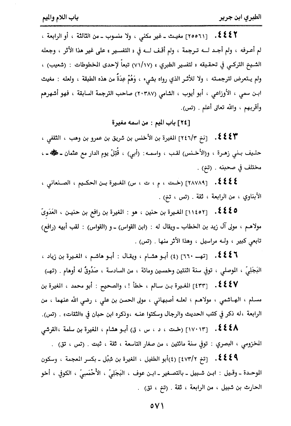 4443. [نخ 3/ 246] المغيرة بن الأخنس بن شريق بن عمرو بن وهب، الثقفي، حليف بني زهرة، و (الأخنس) لقب، واسمه: (أبي)، قُتِل يوم الدار مع عثمان - رضي الله عنه - مختلف في صحبنه. (تخ)