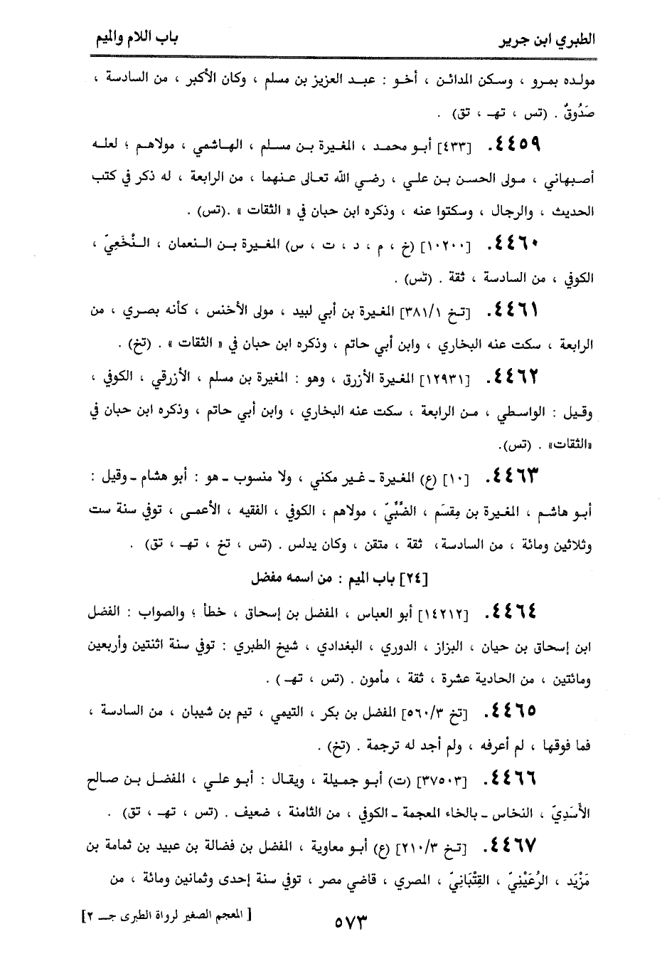 4459. [433] أبو محمد، المغيرة بن مسلم، الهاشمي، مولاهم، لعله أصبهاني، مولى الحسن بن علي، رضي الله تعالى عنهما، من الرابعة، له ذكر في كتب الحديث، والرجال، وسكتوا عنه، وذكره ابن حبان في ((الثقات)). (تس).