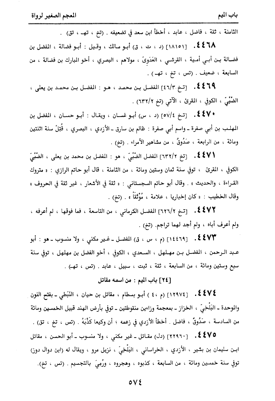 4471. [تخ 2/ 632] المفضل الضبي، هو: المفضل بن محمد بن يعلى، الضبي، الكوفي، المقرئ، توفي سنة ثمان وستين ومائة، من الثامنة، قال أبو حاتم الرازي: ((متروك القراءة، والحديث))، وقال أبو حاتم السجستاني: ((ثقة في الأشعار، غير ثقة في الحروف)) وقال الخطيب: ((كان إخباريا، علامة، مُوثَقًَا)). (تخ).