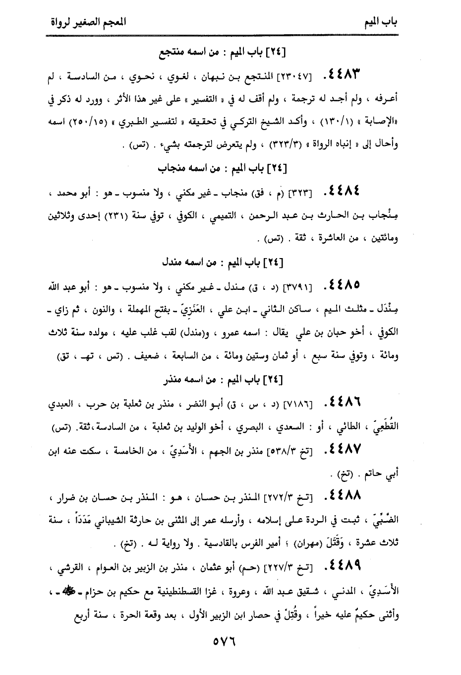 4484. [323] (م، فق) منجاب - غير مكني، ولا منسوب - هو: أبو أحمد مِنجاب بن الحارث بن عبد الرحمن، التميمي، الكوفي، توفي سنة (231) إحدى وثلاثين ومائتين، من العاشرة، ثقة. (تس).