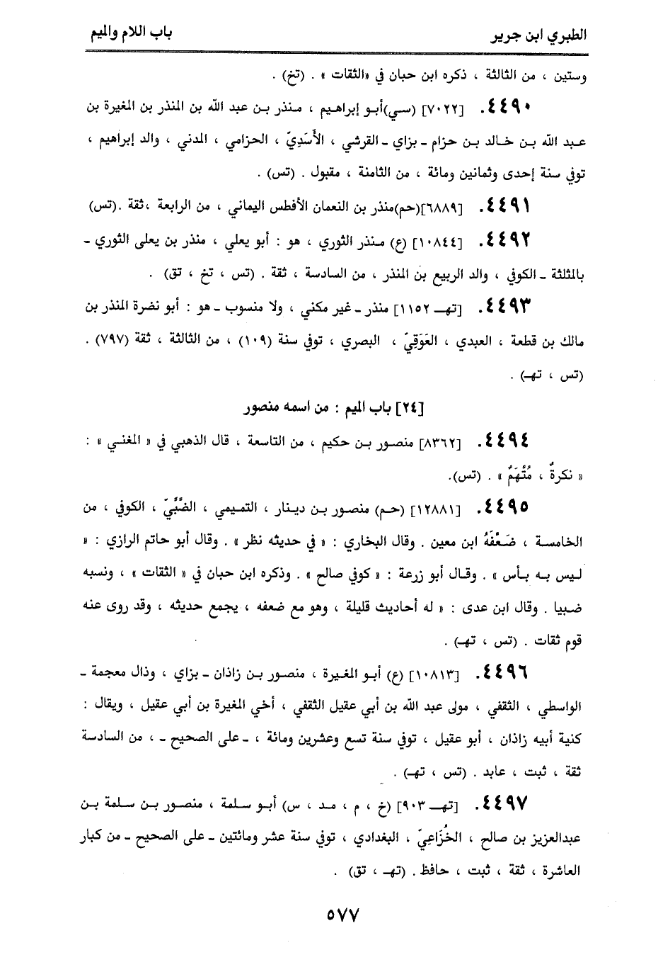 4493. [تهـ 1152] منذر - غير مكني، ولا منسوب - هو: أبو نضرة المنذر بن مالك بن قطعة، العبدي، العَوَقِي، البصري، توفي سنة (109)، من الثالثة، ثقة (797). (تس، تهـ).