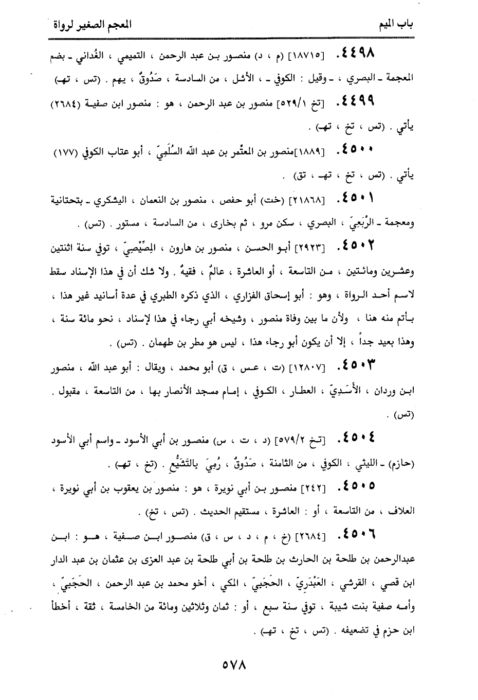 4499. [تخ 1/ 529] منصور بن عبد الرحمن، هو: منصور ابن صفية (2684) يأتي. (تس، تخ، تهـ).
