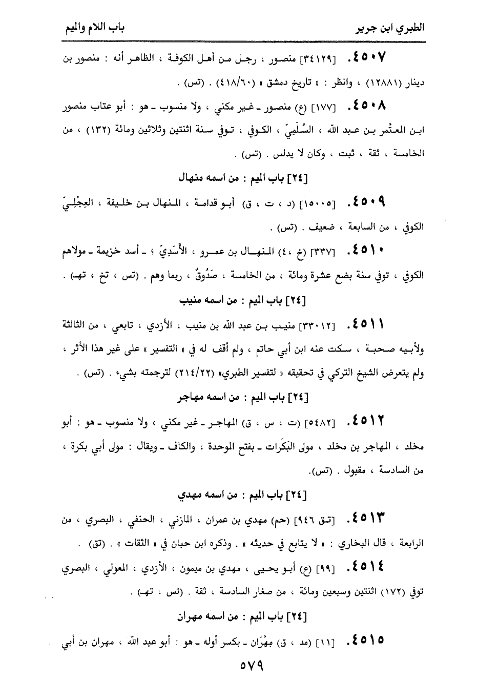 4511. [33012] منيب بن عبد الله بن منيب، الأزدي، تابعي، من الثالثة ولأبيه صحبة، سكت عنه ابن أبي حاتم، ولم أقف له في ((التفسير)) على غير هذا الأثر، ولم يتعرض الشيخ التركي في تحقيقه ((لتفسير الطبري)) (22/ 214) لترجمته بشيء. (تس).