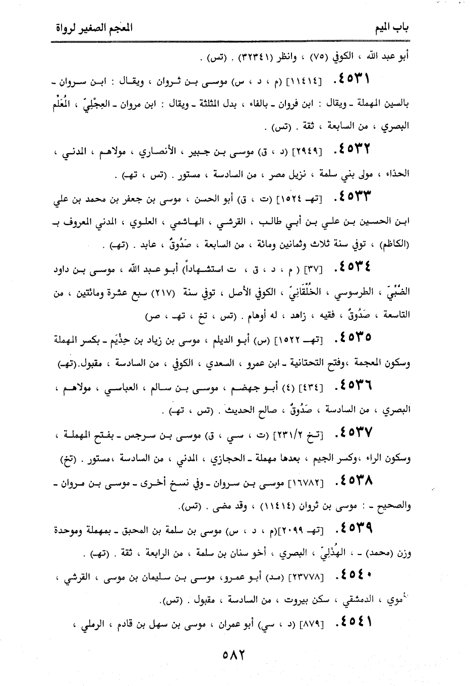 4533. [تهـ 1524] (ت، ق) أبو الحسن، موسى بن جعفر بن محمد بن علي بن الحسين بن علي بن أبي طالب، القرشي، الهاشمي، العلوي، المدني المعروف بـ (الكاظم)، توفي سنة ثلاث وثمانين ومائة، من السابعة، صَدُوقٌ، عابد. (تهـ).