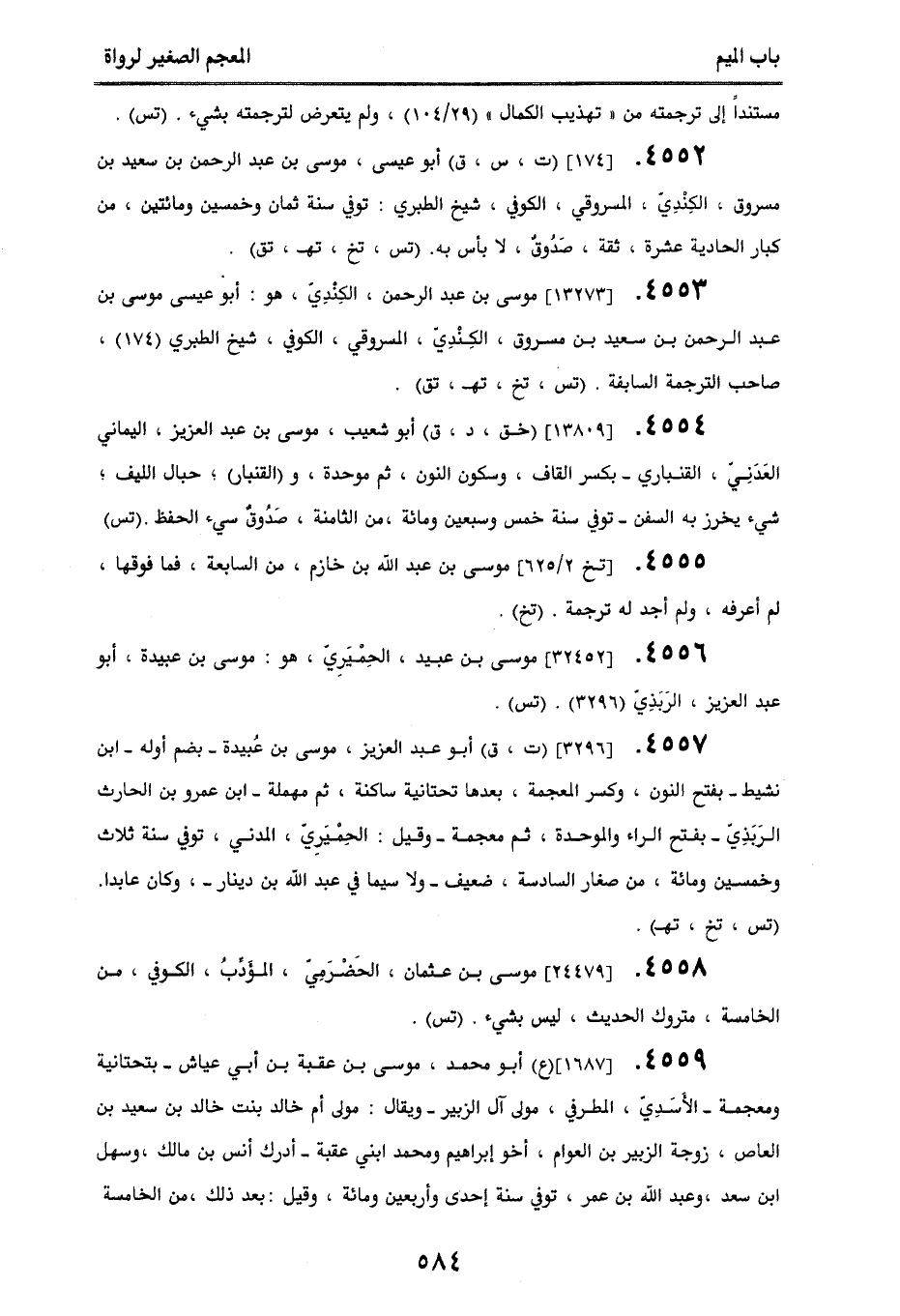 4553. [13273] موسى بن عبد الرحمن، الكندِي، هو: أبو عيسى موسى بن عبد الرحمن بن سعيد بن مسروق، الكندِي، المسروقي، الكوفي، شيخ الطبري (174)، صاحب الترجمة السابقة. (تس، تخ، تهـ، تق).