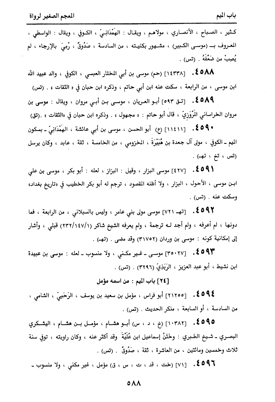 4590. [11411] (ع) أبو الحسن، موسى بن أبي عائشة، الهَمدَانِيَ - بسكون الميم - الكوفي، مولى آل جعدة بن هُبَيرَة، المخزومي، من الخامسة، ثقة، عابد، وكان يرسل. (تس، تخ، تهـ).