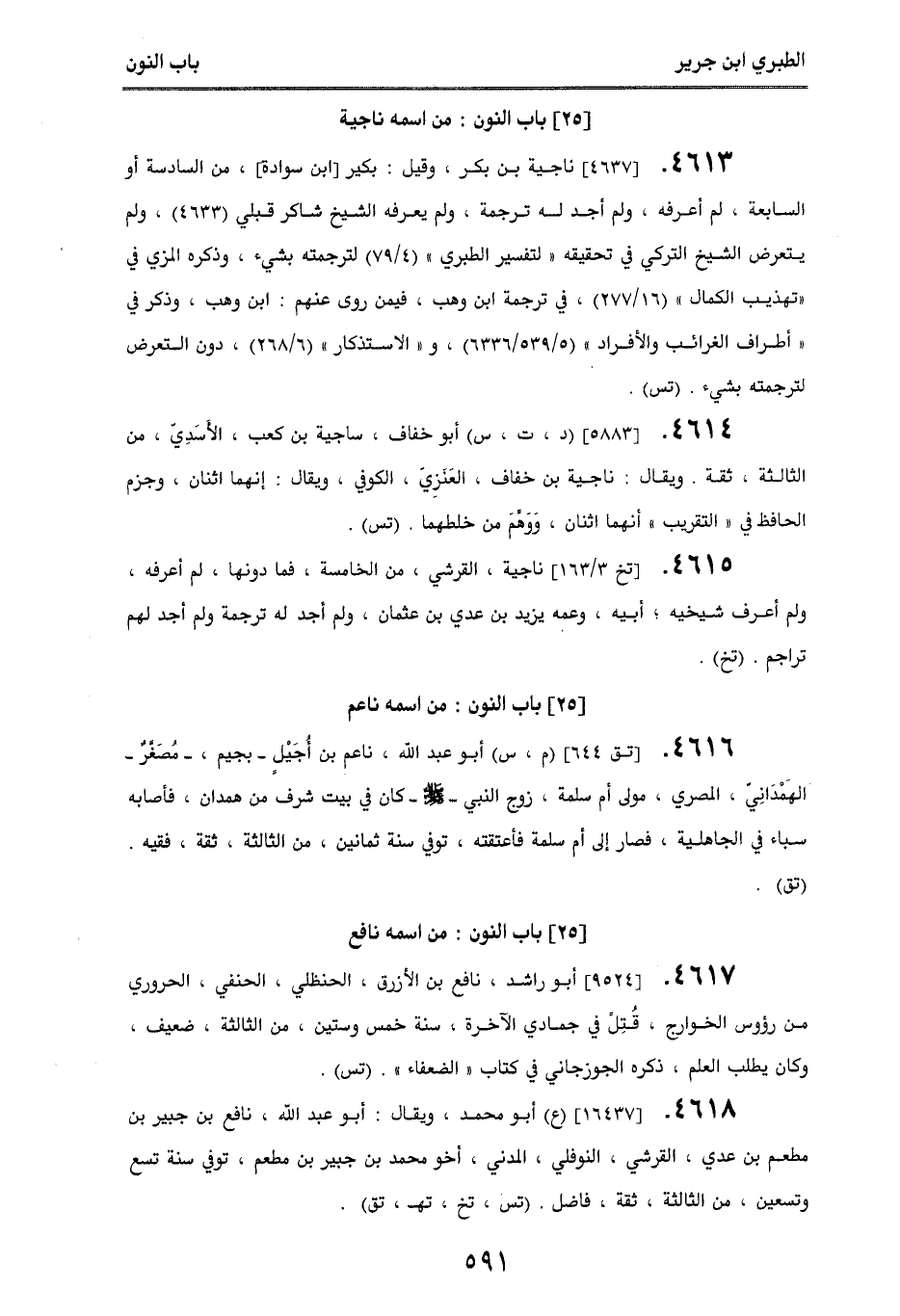 4615. [تخ 3/ 163] ناجية، القرشي، من الخامسة، فما دونها، لم أعرفه، ولم أعرف شيخيه، أبيه، وعمه يزيد بن عدي بن عثمان، ولم أجد له ترجمة ولم أجد لهم تراجم. (تخ).