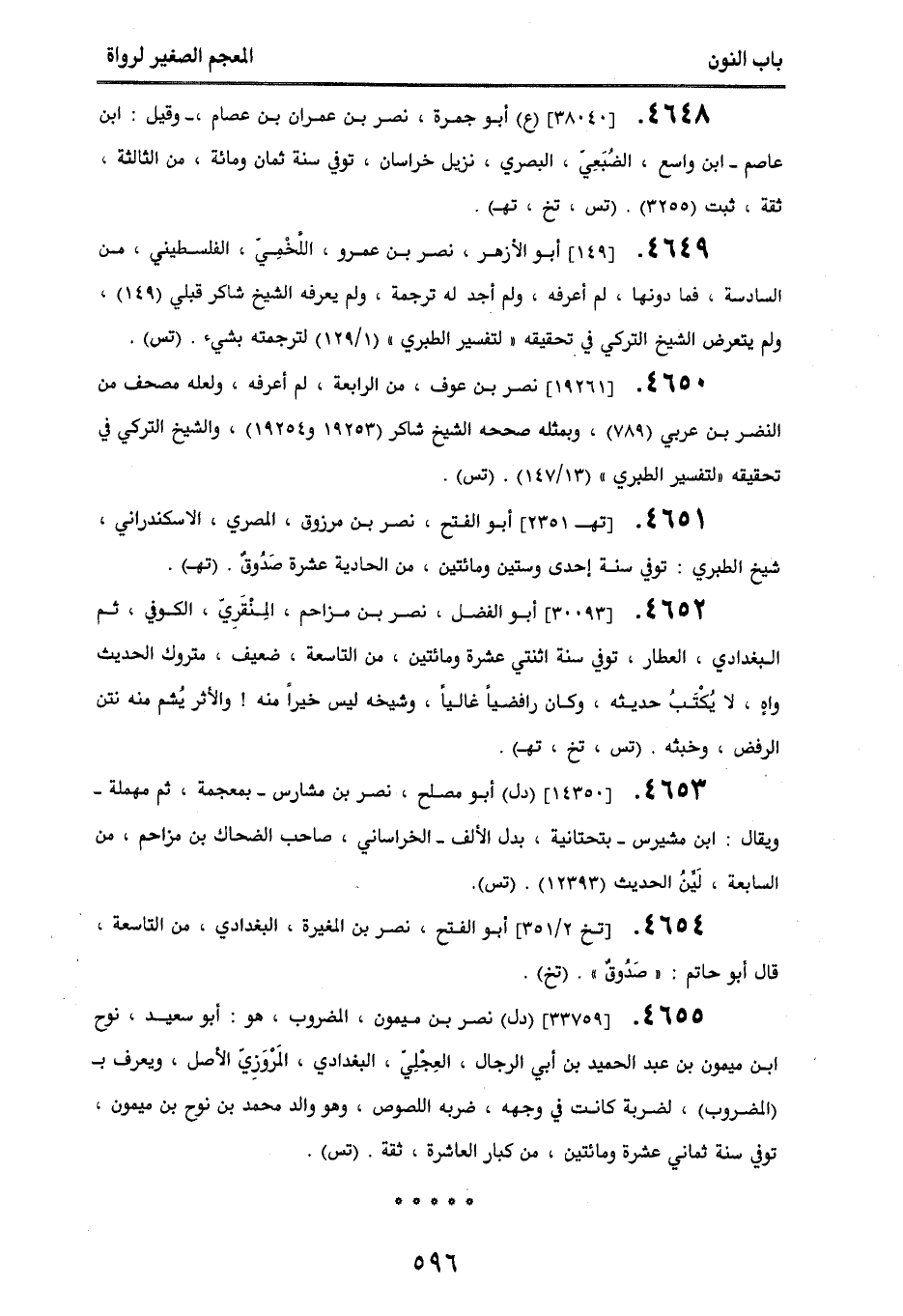 4649. [149] أبو الأزهر، نصر بن عمرو اللخمِي، الفلسطيني، من السادسة، فما دونها، لم أعرفه، ولم أجد له ترجمة، ولم يعرفه الشيخ شاكر قبلي (149)، ولم يتعرض الشيخ التركي في تحقيقه ((لتفسير الطبري)) (1/ 129) لترجمته بشيء. (تس).