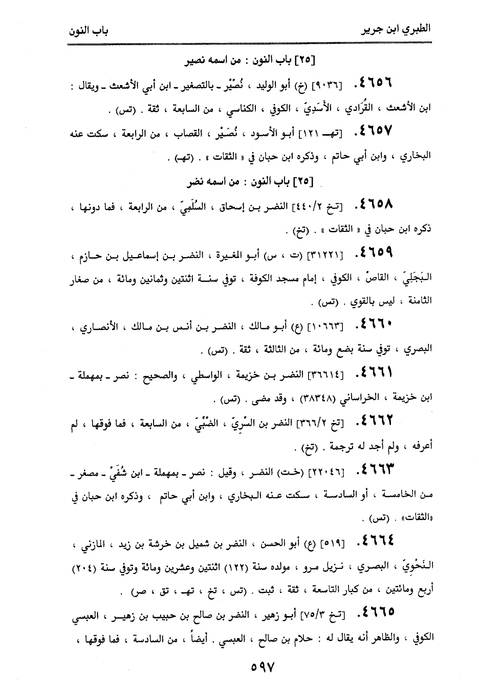 4664. [519] (ع) أبو الحسن، النضر بن شميل بن خرشة بن زيد، المازني، النَحوِي، البصري، نزيل مرو، مولده سنة (122) اثنتين وعشرين ومائة وتوفي سنة (204) أربع ومائتين، من كبار التاسعة، ثقة، ثبت. (تس، تخ، تهـ، تق، صر).