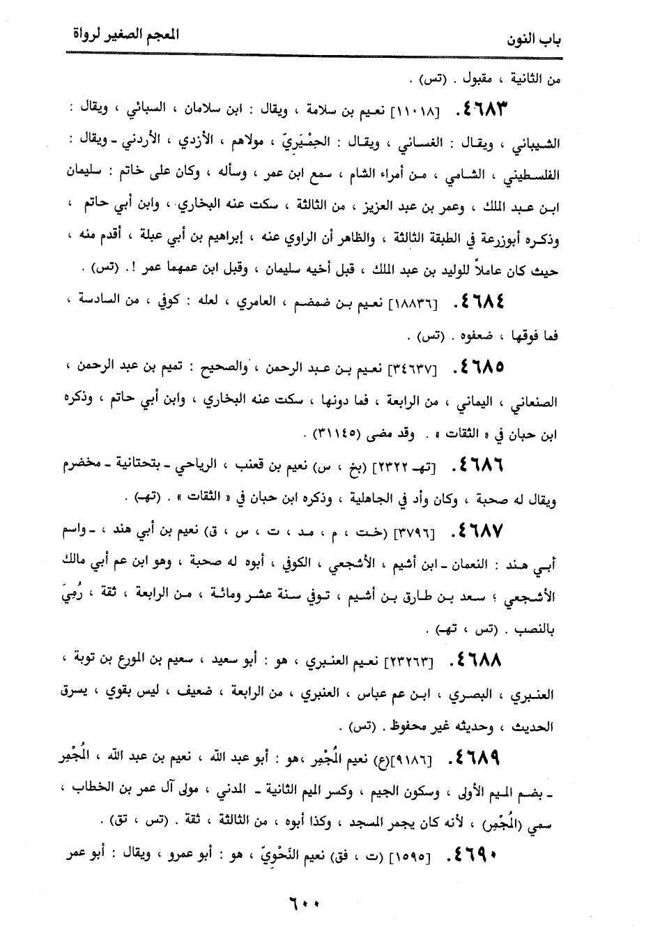 4685. [34637] نعيم بن عبد الرحمن، والصحيح: تميم بن عبد الرحمن، الصنعاني، اليماني، من الرابعة، فما دونها، سكت عنه البخاري، وابن أبي حاتم، وذكره ابن حبان في ((الثقات)). وقد مضى (31145).