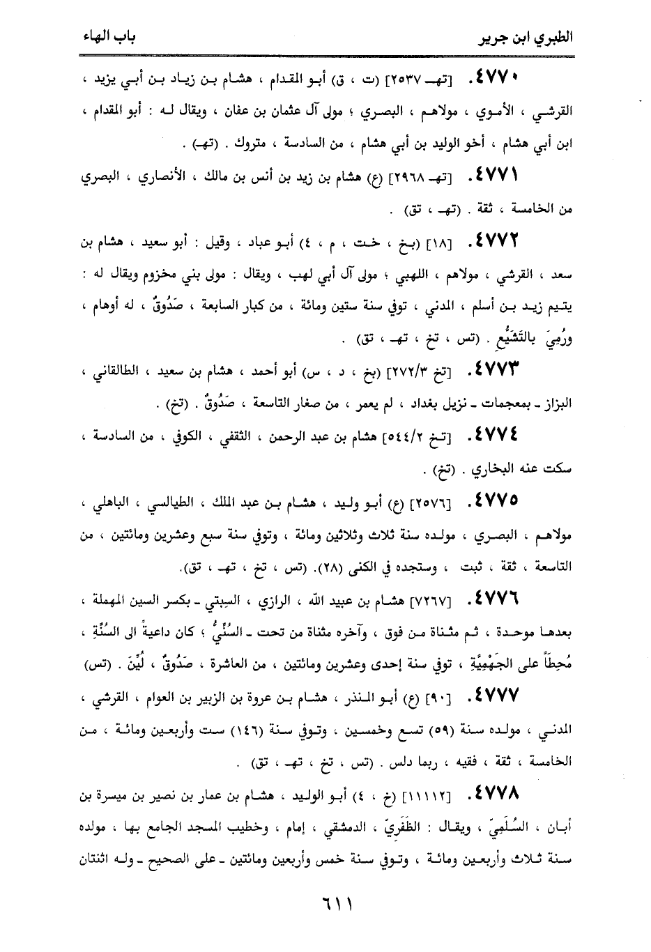 4775. [2576] (ع) أبو وليد، هشام بن عبد الملك، الطيالسي، الباهلي، مولاهم، البصري، مولده سنة ثلاث وثلاثين ومائة، وتوفي سنة سبع وعشرين ومائتين، من التاسعة، ثقة، ثبت، وستجده في الكنى (28). (تس، تخ، تهـ، تق).