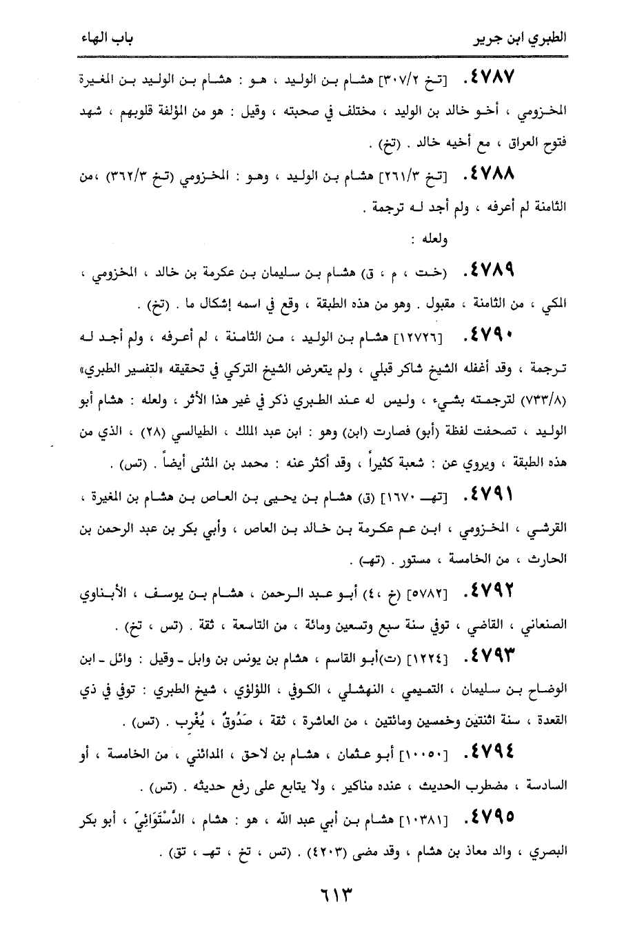 4787. [تخ 2/ 307] هشام بن الوليد، هو: هشام بن الوليد بن المغيرة المخزومي، أخو خالد بن الوليد، مختلف في صحبته، وقيل: هو من المؤلفة قلوبهم، شهد فتوح العراق، مع أخيه خالد. (تخ).