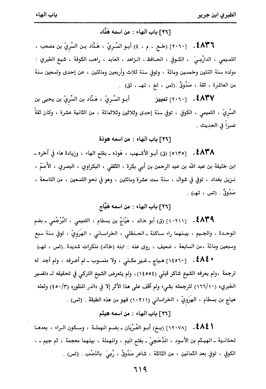 4836. [2060] (خع، م، 4) أبو السرِي، هَناد بن السرِي بن مصعب، التميمي، الدارمِي، الكوفي، الحافظ، الزاهد، العابد، راهب الكوفة، شيخ الطبري: مولده سنة اثنتين وخمسين ومائة، وتوفي سنة ثلاث وأربعين ومائتين، عن إحدى وتسعين سنة من العاشرة، ثقة، صَدوق. (تس، تخ، تهـ، تق).