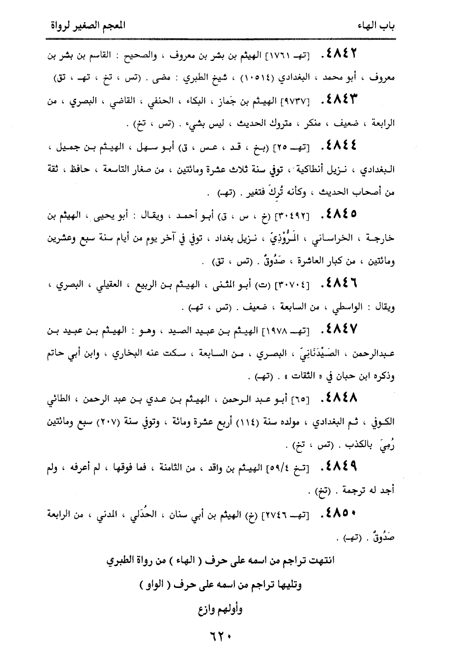 4848. [65] أبو عبد الرحمن، الهيثم بن عدي بن عبد الرحمن، الطائي، الكوفي، ثم البغدادي، مولده سنة (114) أربع عشرة ومائة، وتوفي سنة (207) سبع ومائتين رمِي بالكذب. (تس، تخ).