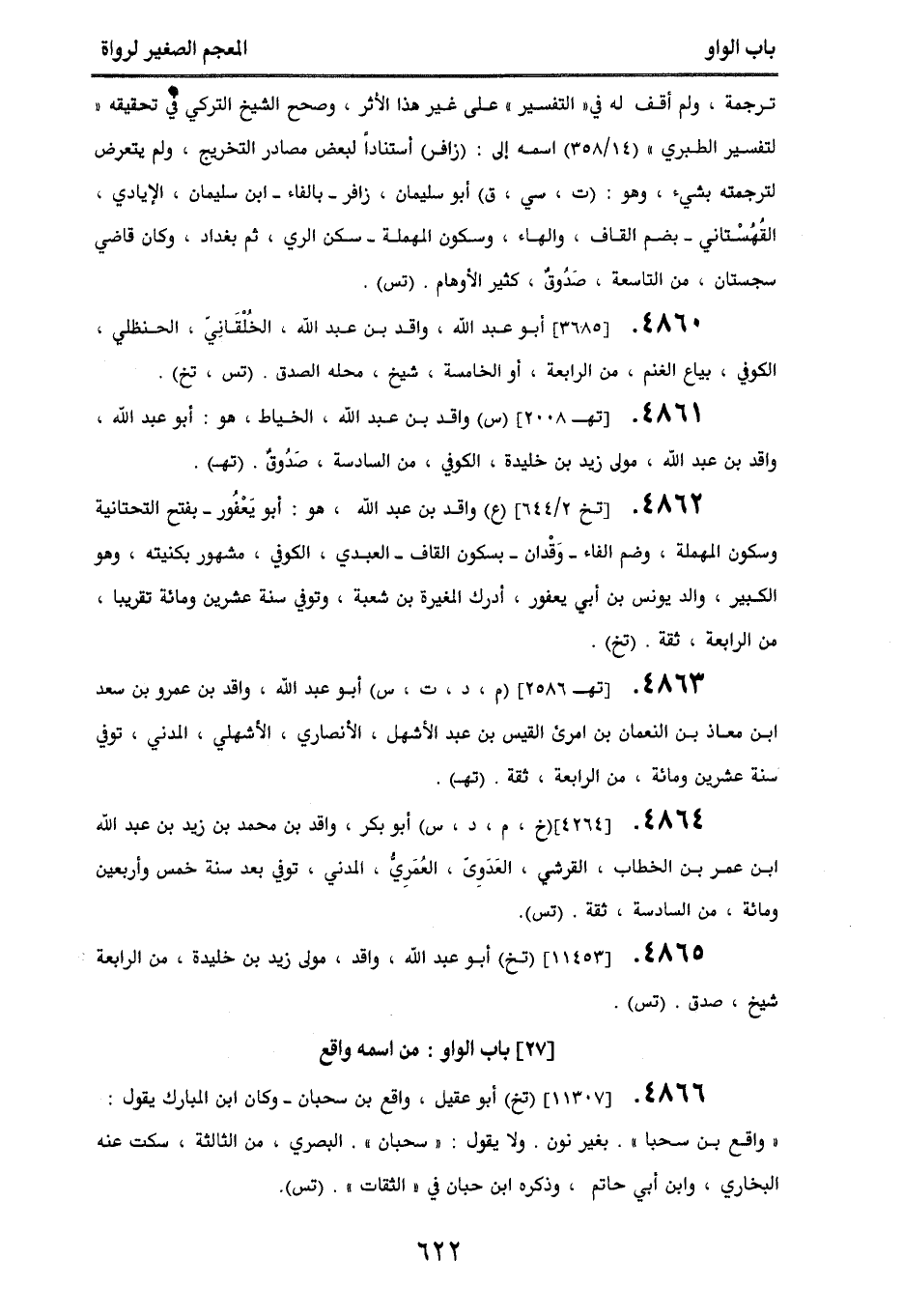 4866. [11307] (تخ) أبو عقيل، واقع بن سحبان - وكان ابن المبارك يقول: ((واقع بن سحبا))، بغير نون. ولا يقول: ((سحبان))، البصري، من الثالثة، سكت عنه البخاري، وابن أبي حاتم، وذكره ابن حبان في ((الثقات)). (تس).