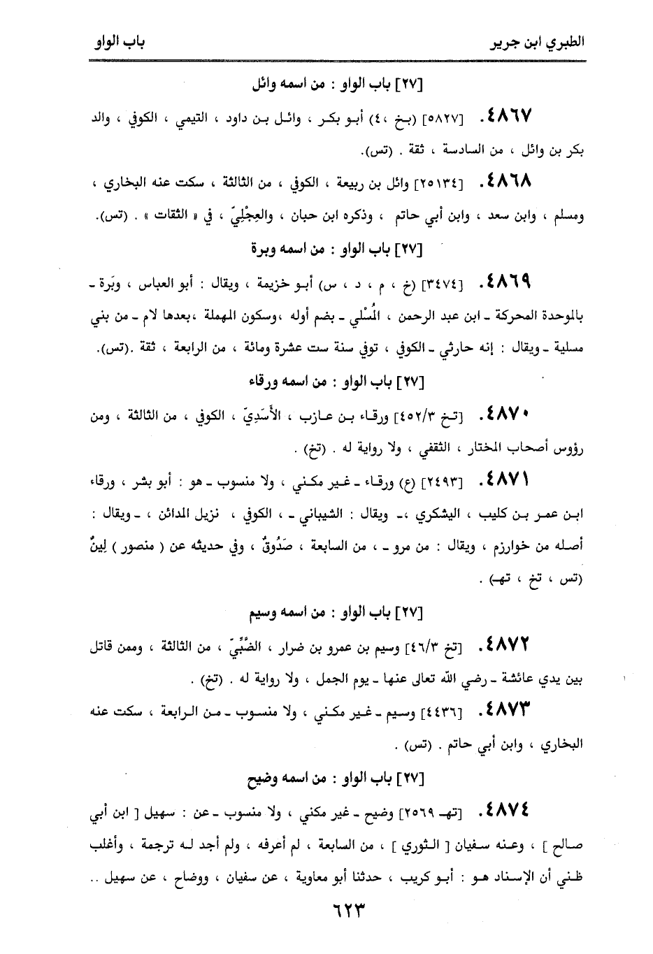 4868. [25134] وائل بن ربيعة، الكوفي، من الثالثة، سكت عنه البخاري، ومسلم، وابن سعد، وابن أبي حاتم، وذكره ابن حبان، والعِجلِي، في ((الثقات)). (تس).
