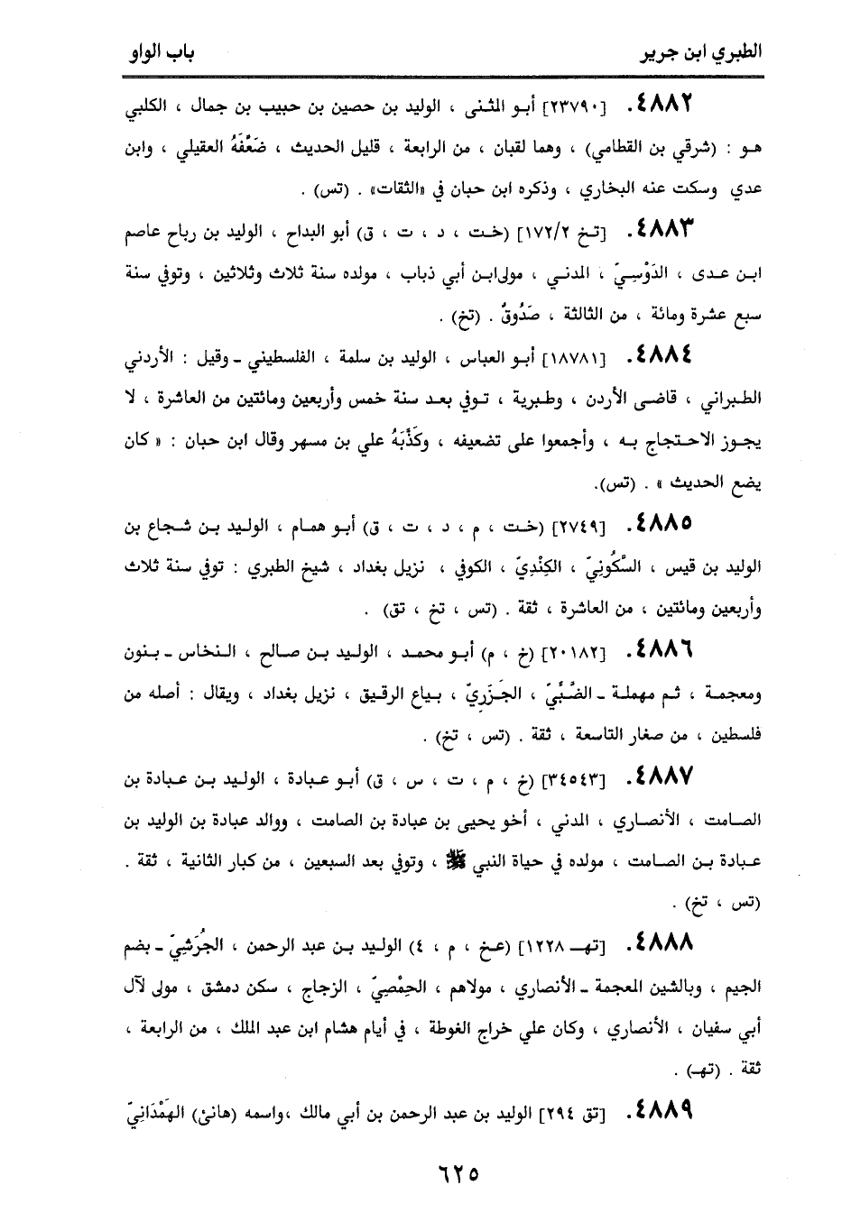 4885. [2749] (خت، م، د، ت، ق) أبو همام، الوليد بن شجاع بن الوليد بن قيس، السكونِي، الكندِي، الكوفي، نزيل بغداد، شيخ الطبري: توفي سنة ثلاث وأربعين ومائتين، من العاشرة، ثقة. (تس، تخ، تق).