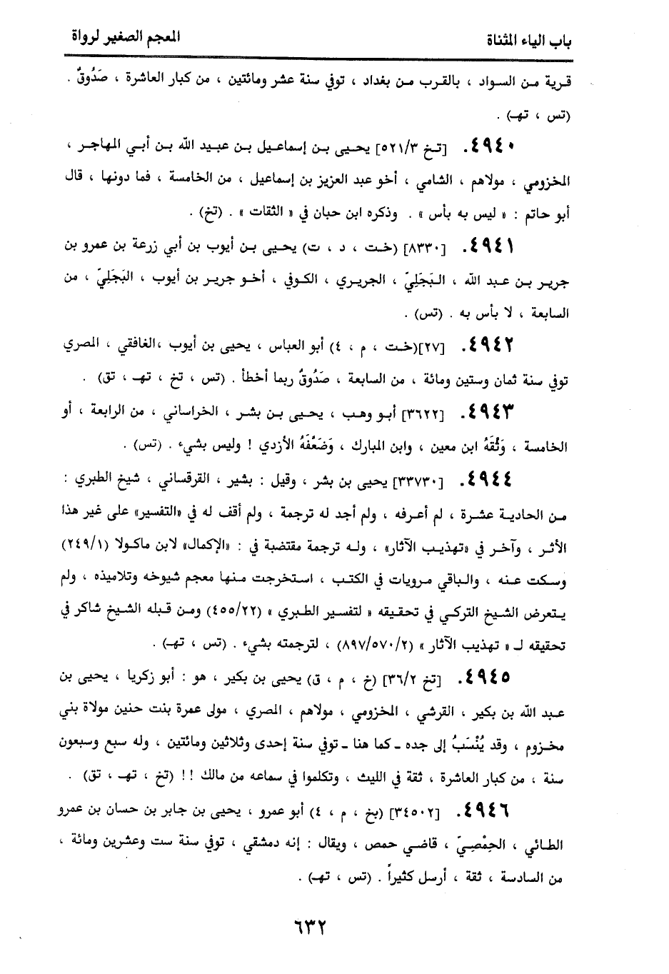 4945. [تخ 2/ 36] (خ، م، ق) يحيى بن بكير، هو: أبو زكريا، يحيى بن عبد الله بن بكير، القرشي، المخزومي، مولاهم، المصري، مولى عمرة بنت حنين مولاة بني مخزوم، وقد ينسَب إلى جده - كما هنا - توفي سنة إحدى وثلاثين ومائتين، وله سبع وسبعون سنة، من كبار العاشرة، ثقة في الليث، وتكلموا في سماعه من مالك!! (تخ، تهـ، تق).