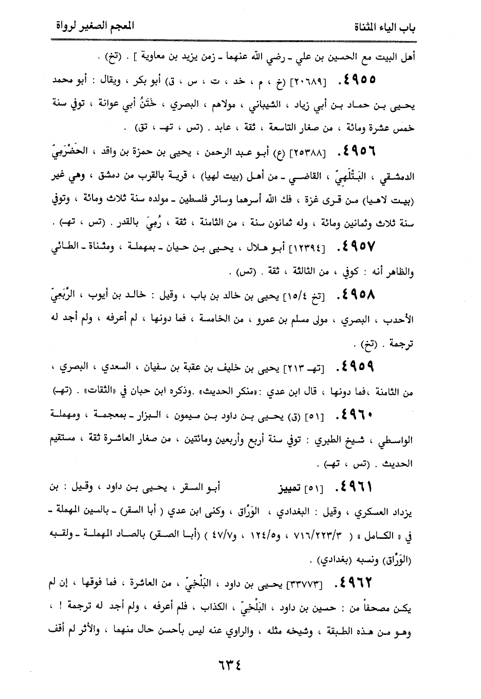 4958. [تخ 4/ 15] يحيى بن خالد بن باب، وقيل: خالد بن أيوب، الربَعِي الأحدب، البصري، مولى مسلم بن عمرو، من الخامسة، فما دونها، لم أعرفه، ولم أجد له ترجمة. (تخ).