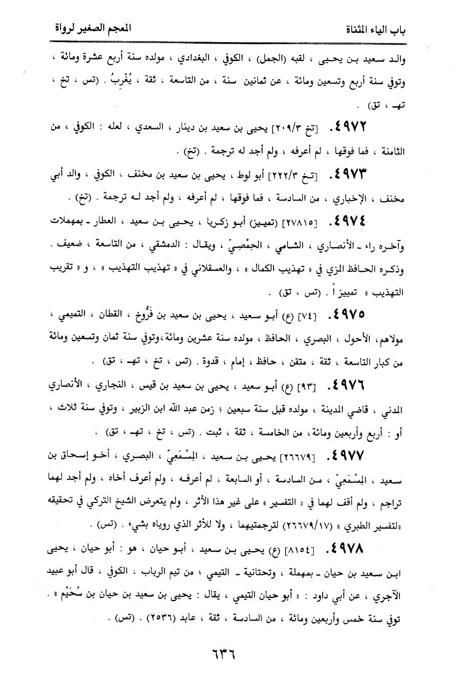 4975. [74] (ع) أبو سعيد، يحيى بن سعيد بن فَروخ، القطان، التميمي، مولاهم، الأحول، البصري، الحافظ، مولده سنة عشرين ومائة، وتوفي سنة ثمان وتسعين ومائة، من كبار التاسعة، ثقة، متقن، حافظ، إمام، قدوة. (تس، تخ، تهـ، تق).