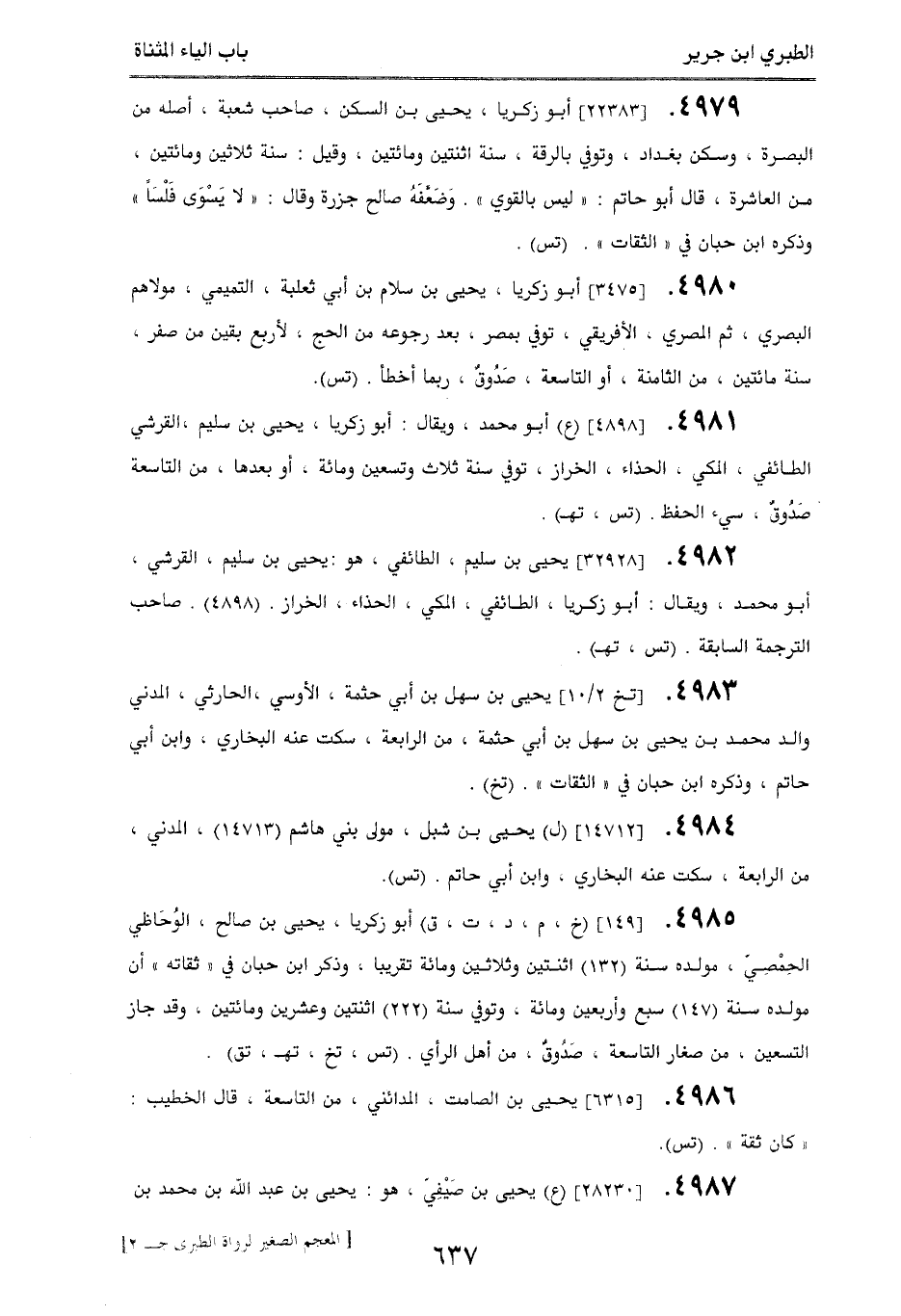 4980. [3475] أبو زكريا، يحيى بن سلام بن أبي ثعلبة، التميمي، مولاهم البصري، ثم المصري، الأفريقي، توفي بمصر، بعد رجوعه من الحج، لأربع بقين من صفر، سنة مائتين، من الثامنة، أو التاسعة، صَدوق ربما أخطأ. (تس).