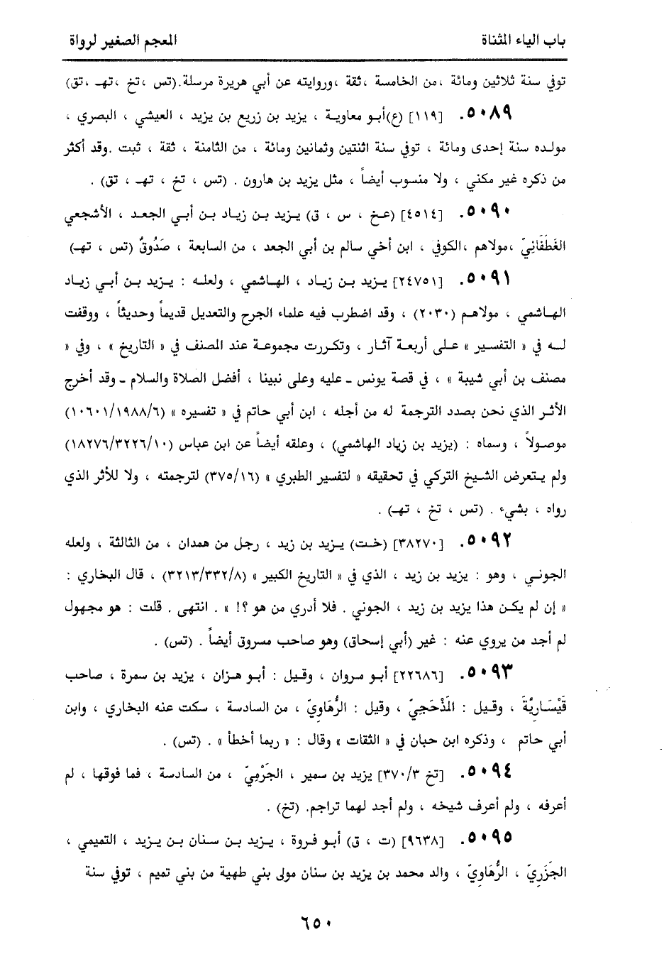 5094. [تخ 3/ 370] يزيد بن سمير، الجَرمِي، من السادسة، فما فوقها، لم أعرفه، ولم أعرف شيخه، ولم أجد لهما تراجم. (تخ).