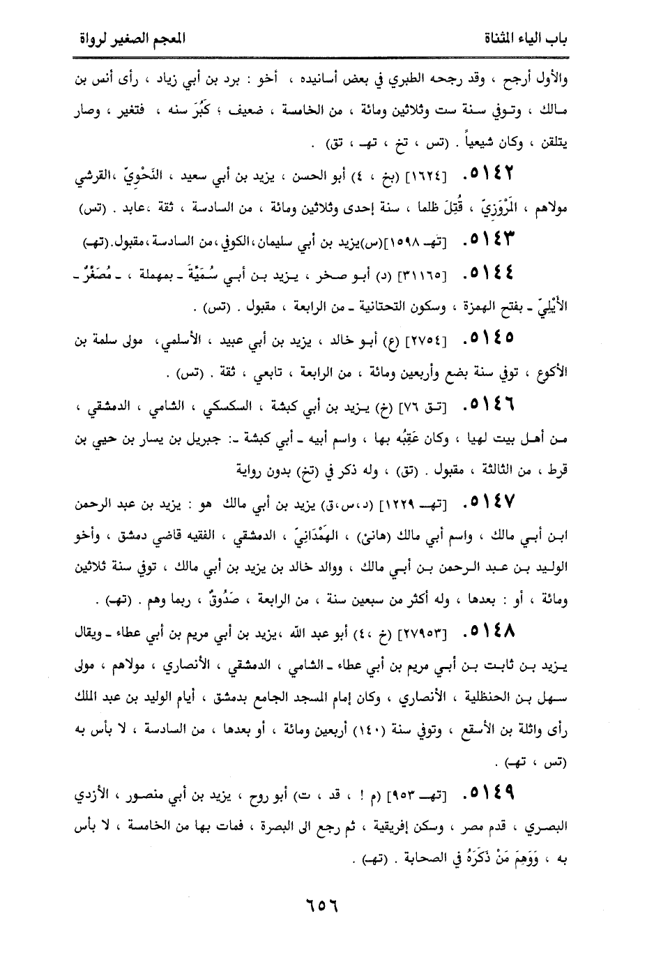 5142. [1624] (بخ، 4) أبو الحسن، يزيد بن أبي سعيد، النَحوِي، القرشي، مولاهم، المَروَزِي، قتِل ظلمًا، سنة إحدى وثلاثين ومائة، من السادسة، ثقة، عابد. (تس).