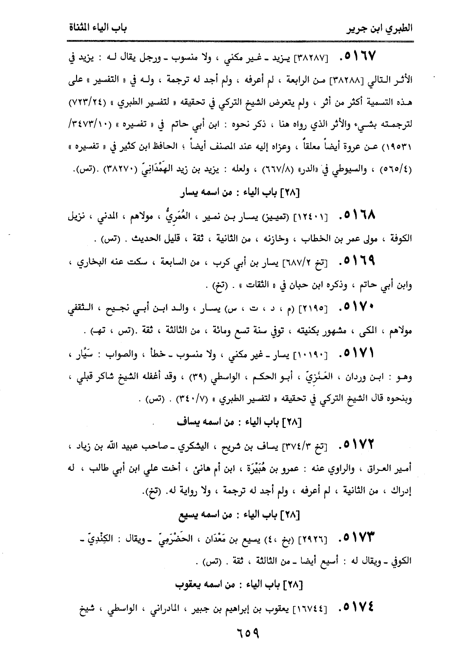 5170. [2195] (م، د، ت، س) يسار، والد ابن أبي نجيح، الثقفي، مولاهم، المكي، مشهور بكنيته، توفي سنة تسع ومائة، من الثالثة، ثقة. (تس، تهـ).