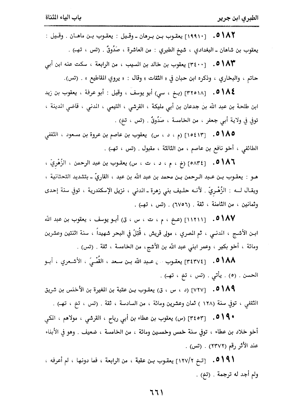 5189. [727] (د، س، ق) يعقوب بن عتبة بن المغيرة بن الأخنس بن شريق الثقفي، توفي سنة (128) ثمان وعشرين ومائة، من السادسة، ثقة. (تس، تخ، تهـ).