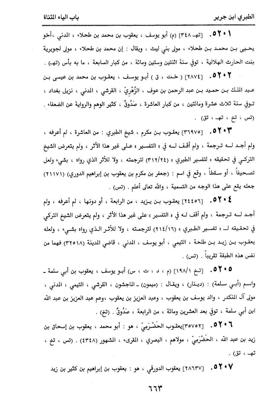 5204. [24456] يعقوب بن يزيد، من الرابعة، أو دونها، لم أعرفه، ولم أجد له ترجمة، ولم أقف له في ((التفسير)) على غير هذا الأثر، ولم يتعرض الشيخ التركي في تحقيقه ((لتفسير الطبري)) (16/ 214) لترجمته، ولا للأثر الذي رواه بشيء، ولعله يعقوب بن زيد بن طلحة، التيمي، أبو يوسف، المدني، قاضي المدينة (32518) فهما من نفس هذه الطبقة تقريبًا. (تس).
