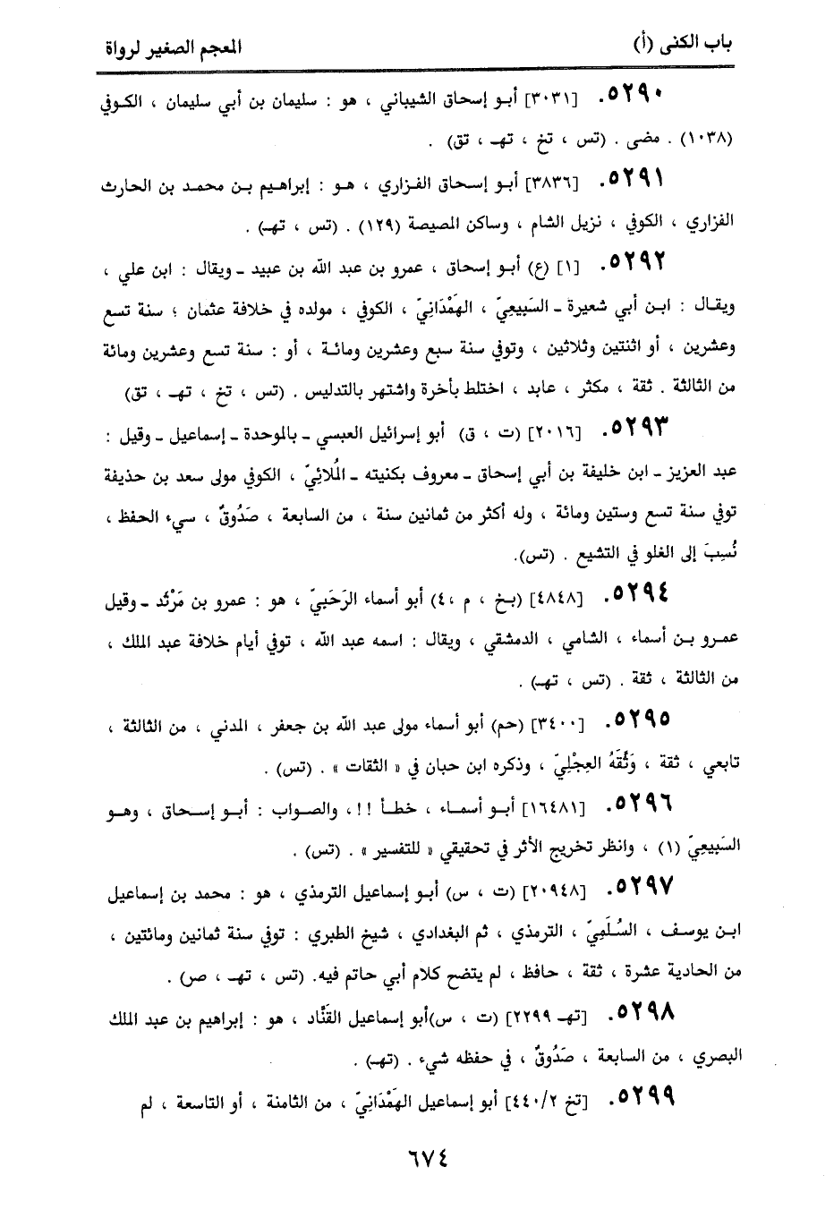 5292. [1] (ع) أبو إسحاق، عمرو بن عبد الله بن عبيد - ويقال: ابن علي، ويقال: ابن أبي شعيرة - السَبيِعي، الهمداني، الكوفي، مولده في خلافة عثمان، سنة تسع وعشرين، أو اثنتين وثلاثين، وتوفي سنة سبع وعشرين ومائة، أو: سنة تسع وعشرين ومائة من الثالثة، ثقة، مكثر، عابد، اختلط بأخرة واشتهر بالتدليس. (تس، تخ، تهـ، تق).