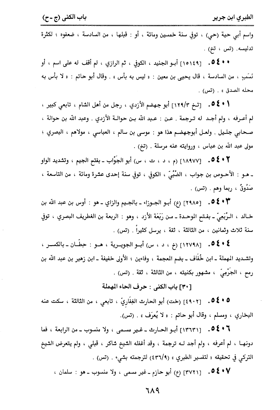 5406. [13631] أبو الحارث - غير مسمى، ولا منسوب - من الرابعة، فما دونها، لم أعرفه، ولم أجد له ترجمة، وقد أغفله الشيخ شاكر قبلي، ولم يتعرض الشيخ التركي في تحقيقه ((لتفسير الطبري)) (9/ 436) لترجمته بسيء. (تس).