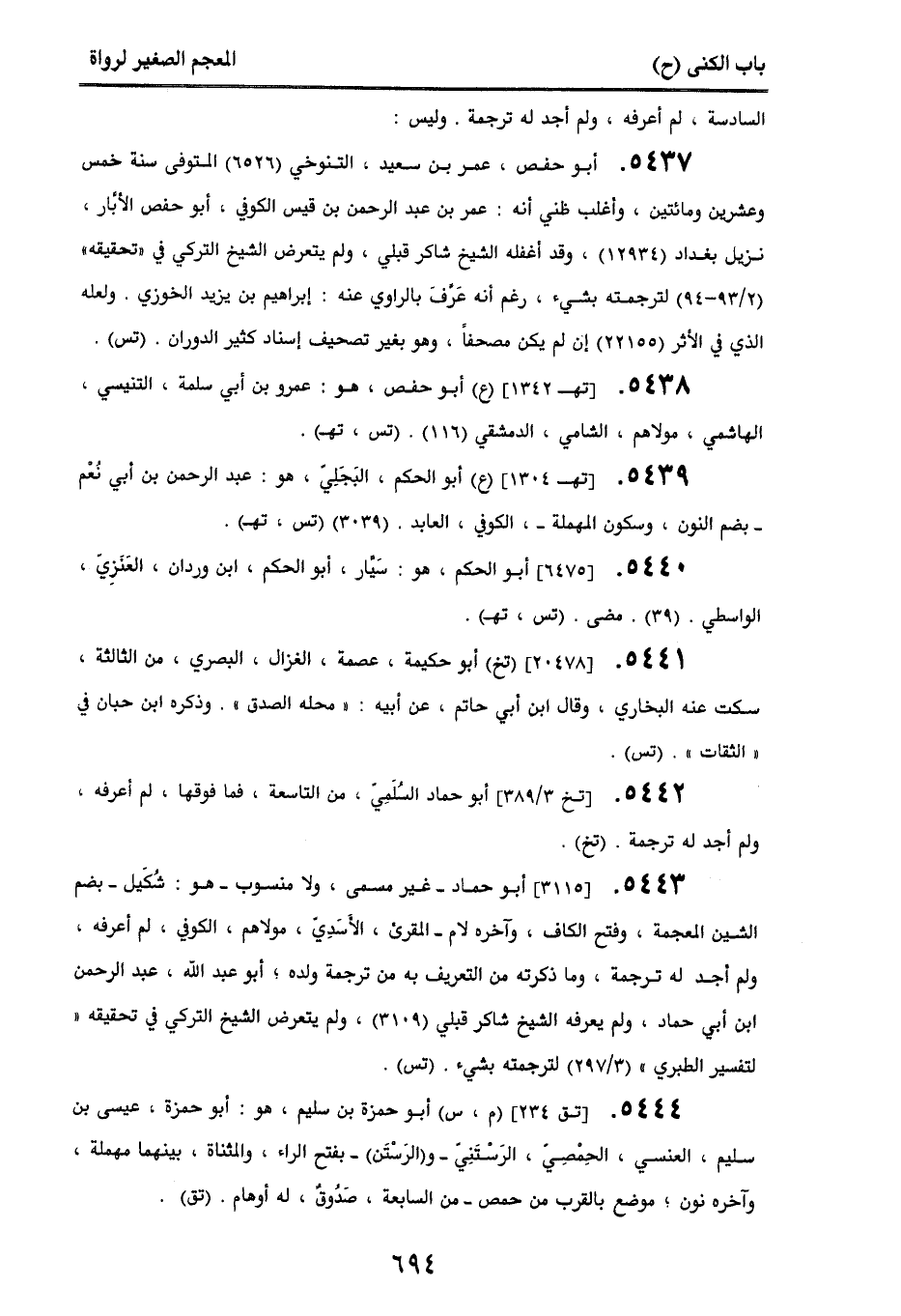 5437. أبو حفص، عمر بن سعيد، التنوخي (6526) المتوفى سنة خمس وعشرين ومائتين، وأغلب ظني أنه: عمر بن عبد الرحمن بن قيس الكوفي، أبو حفص الأبار، نزيل بغداد (12934)، وقد أغفله الشيخ شاكر قبلي، ولم يتعرض الشيخ التركي في ((تحقيقه)) (2/ 93 - 94) لترجمته بشيء، رغم أنه عَرف بالراوي عنه: إبراهيم بن يزيد الخوزي. ولعله الذي في الأثر (22155) إن لم يكن مصحفًا، وهو بغير تصحيف إسناد كثير الدوران. (تس).