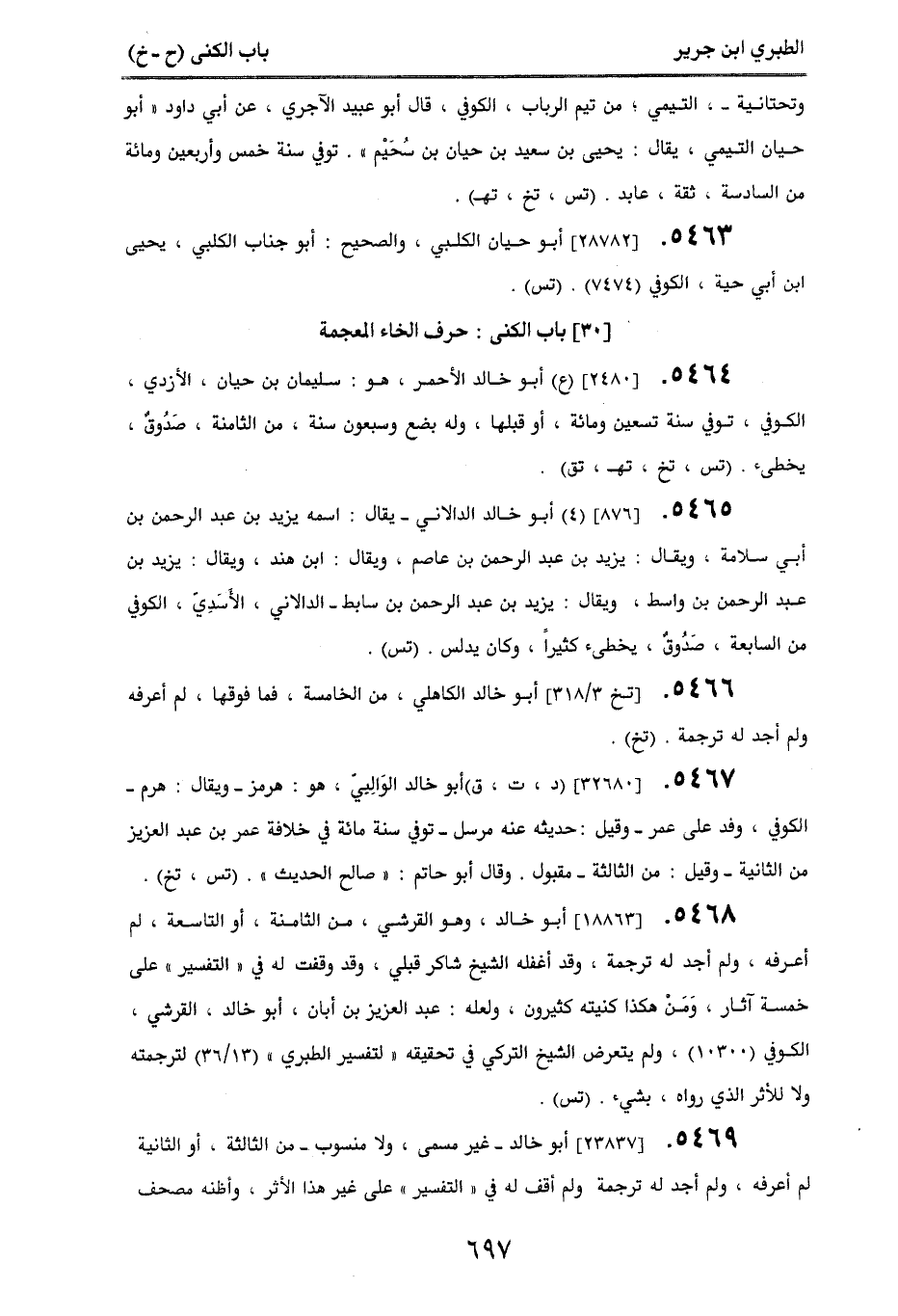5468. [18863] أبو خالد، وهو القرشي، من الثامنة، أو التاسعة، لم أعرفه، ولم أجد له ترجمة، وقد أغفله الشيخ شاكر قبلي، وقد وقفت له في ((التفسير)) على خمسة آثار، وَمَن هكذا كنيته كثيرون، ولعله عبد العزيز بن أبان، أبو خالد، القرشي، الكوفي (10300)، ولم يتعرض الشيخ التركي في تحقيقه ((لتفسير الطبري)) (13/ 36) لترجمته ولا للأثر الذي رواه بشيء. (تس).