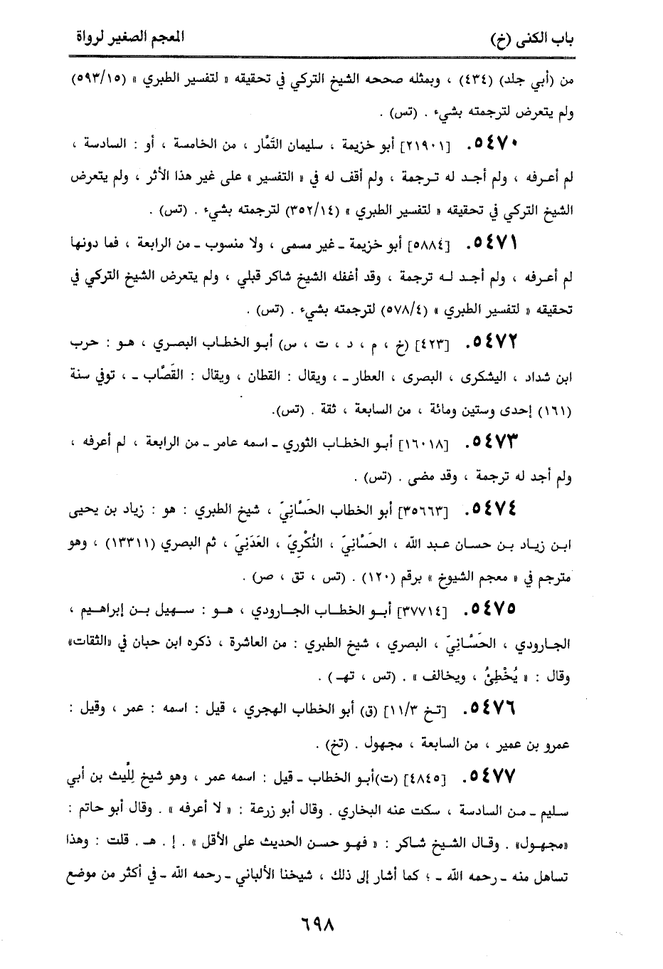 5471. [5884] أبو خزيمة - غير مسمى، ولا منسوب - من الرابعة، فما دونها، لم أعرفه، ولم أجد له ترجمة، وقد أغفله الشيخ شاكر قبلي، ولم يتعرض الشيخ التركي في تحقيقه ((لتفسير الطبري)) (4/ 578) لترجمته بشيء. (تس).