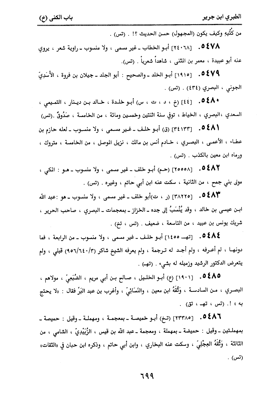 5480. [44] (خ، د، ت، س) أبو خلدة، خالد بن دينار، التميمي، السعدي، البصري، الخياط، توفي سنة اثنتين وخمسين ومائة، من الخامسة، صَدوق. (تس).