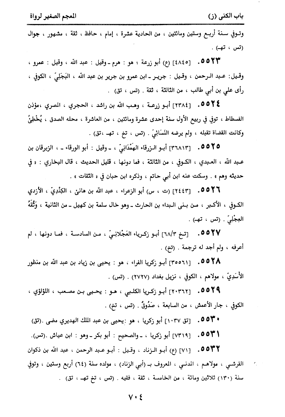 5532. [71] (ع) أبو الزناد، وقيل: أبو عبد الرحمن، عبد الله بن ذكوان القرشي، مولاهم، المدني، المعروف بـ (أبي الزناد)، مولده سنة (64) أربع وستين، وتوفي سنة (130) ثلاثين ومائة، من الخامسة، ثقة، فقيه. (تس، تخ، تهـ، تق).