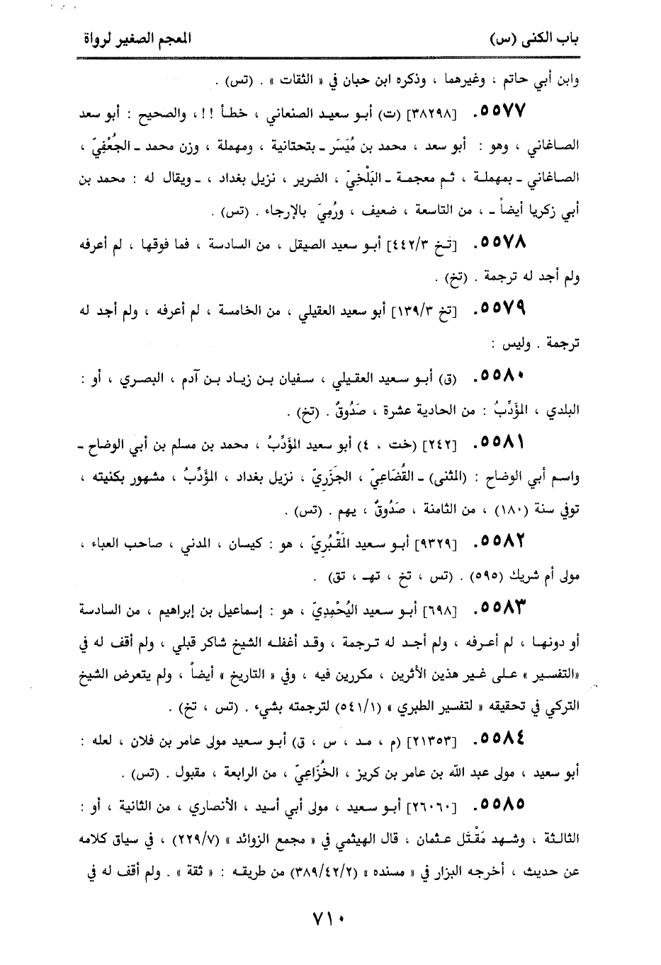 5577. [38298] (ت) أبو سعيد الصنعاني، خطأ!! والصحيح: أبو سعد الصاغاني، وهو: أبو سعد محمد بن ميَسَر - بتحتانية، ومهملة، وزن محمد - الجعفِي، الصاغاني - بمهملة، ثم معجمة - البَلخِي، الضرير، نزيل بغداد - ويقال له: محمد بن أبي زكريا أيضًا - من التاسعة، ضعيف، ورمِي بالإرجاء. (تس).